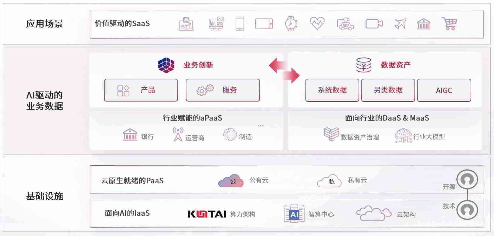 在基础设施层面,,,,基于商业或开源的云原生就绪开发工具与技术组件(PaaS)和面向AI的底层公共基础设施资源(IaaS),,将共同支撑企业完成数字化转型